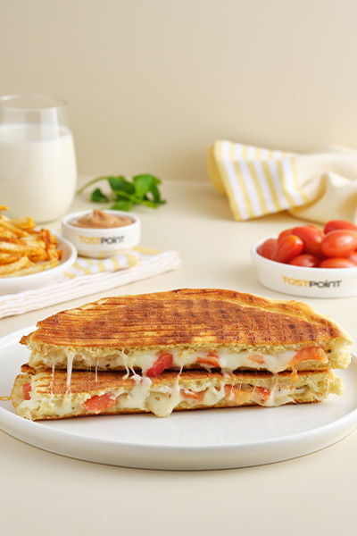 Özel Tost Point Bazlama Ekmeği, Beyaz Peynir, Mozzarella, Domates, Kekik.